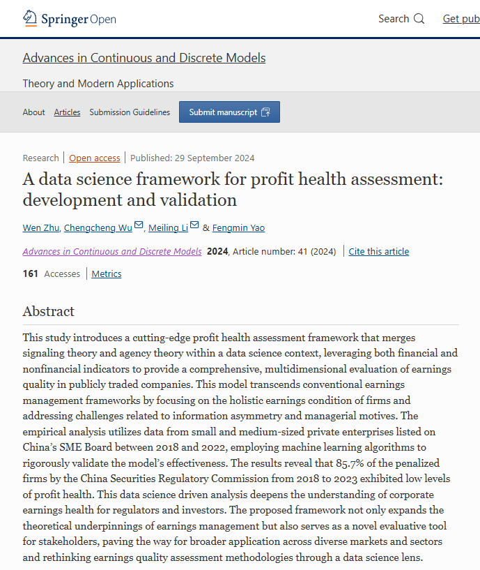近日,米兰在线注册会计学院朱文教授团队论文“A data science framework for profit health assessment: development and validation”在施普林格旗下的国际期刊《Advances in Continuous and Discrete Models》上发表。