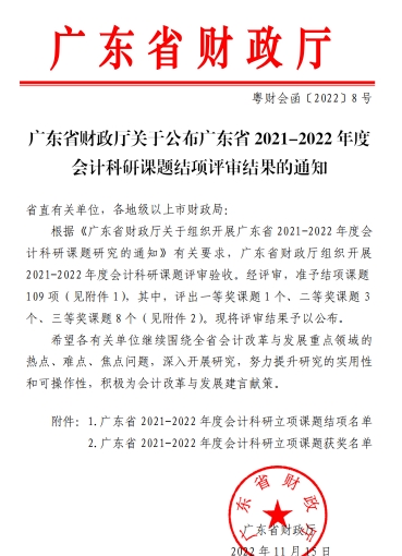 11月15日,广东省财政厅公布了2021-2022年度会计科研课题结项评审结果,本次会计科研课题共有109个通过验收,米兰在线注册会计学院立项的4个全部通过验收,课题结项通过率为100%。