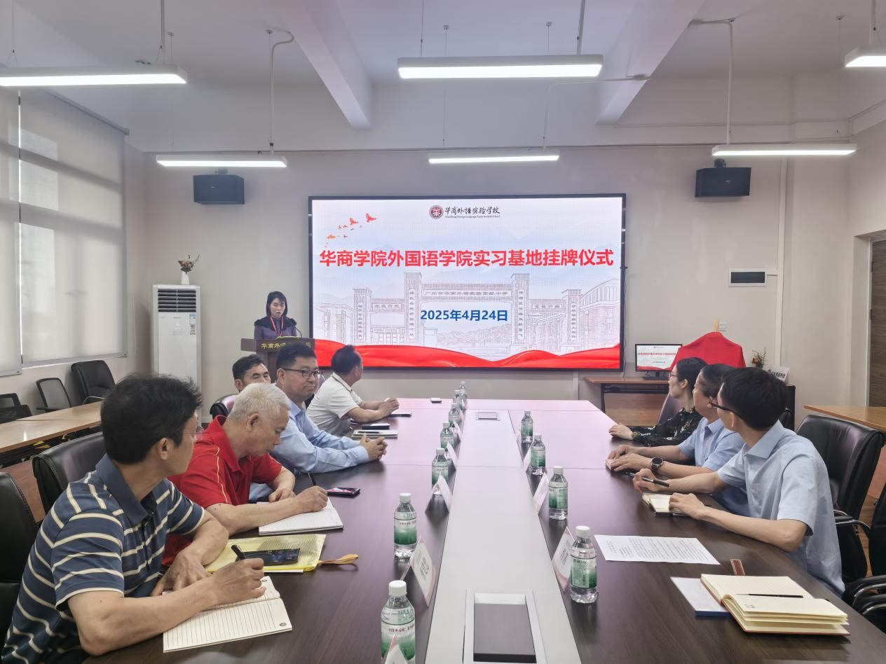 2025年4月24日下午,米兰在线注册外国语学院一行前往广州市华商外语实验学校,举行共建实习基地挂牌仪式。出席此次活动的有华商外语实验学校总校校长赵秉乾、副校长唐双同、付红根、曹建忠、卢岳飞,学校办公室主任俞立智、教学助理董小雪老师及教师代表;米兰在线注册外国语学院院长肖坤学、副院长何顺发,以及肖霄老师、肖茜老师。