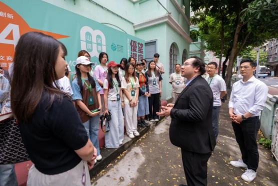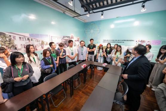 望厦山房项目负责人杨洪伟先生热情接待我校研学团队,围绕园区“以文塑旅、以旅彰文”的创新运营模式展开系统介绍。他结合建筑改造实践,重点解析了历史建筑活化利用,即通过融合传统工艺与现代技术,完整保留建筑历史风貌与文化基因,创新性植入文创市集、数字展陈等业态,构建文化遗产保护与商业价值转化的动态平衡机制,实现历史文物从静态展示到活态叙事的转变。通过展示园区将大三巴牌坊元素转化为系列数字藏品的典型案例,生动演绎政策赋能与技术创新如何协同驱动文化遗产的现代转译,令师生们直观理解文保活化项目中“守正”与“创新”的辩证关系。