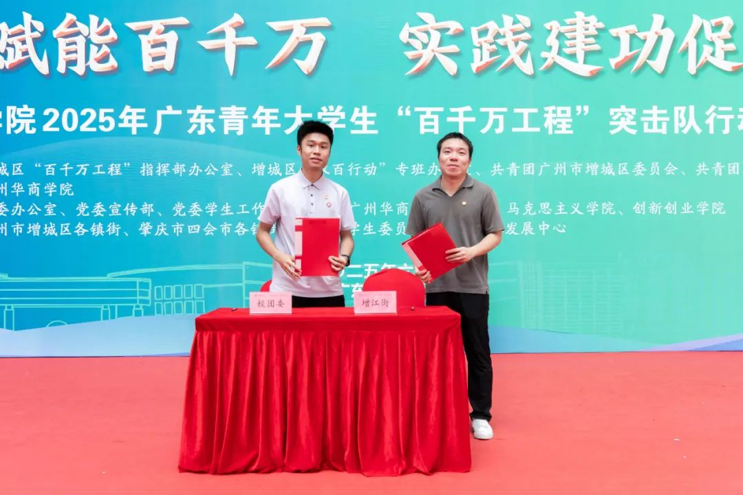 (增城区“百千万工程”指挥办、双百组干部顾钻均为党员社会实践队、国家资助和助学贷款政策下乡行实践团、青年红色筑梦之旅社会实践团授旗)