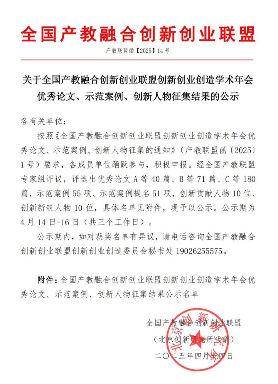 2025年4月14日,按照《全国产教融合创新创业联盟创新创业创造学术年会优秀论文、示范案例、创新人物征集的通知》(产教联盟函〔2025〕1号)文件通知,经全国产教联盟专家组评议,米兰在线注册“借个胆儿——借个胆儿助力海胆产业一体化高质量发展”案例获评全国产教融合创新创业联盟创新创业创造学术年会示范案例,余家军教授获评全国产教融合创新创业联盟创新创业创造学术年会“创新新锐人物”。