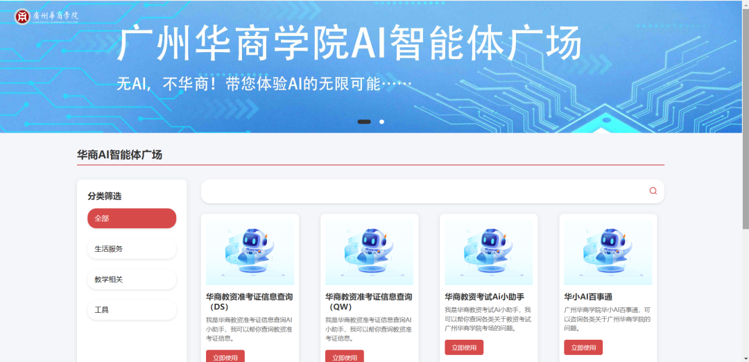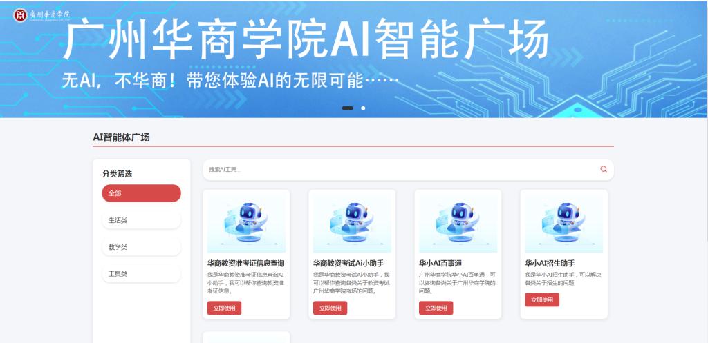 为了更加方便教职工们在工作上使用,除了以上两种便利方式外,教职工们还可以通过统一门户进入【华商AI智能体广场】。