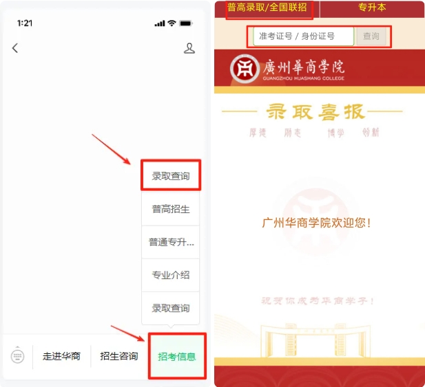 考生可通过学校官方微信公众号查询,具体路径为点击【校园生活】-【录取查询】-【普高录取/全国联招】,输入个人信息即可查询;也可通过招生办官方微信公众号查询,点击【招考信息】-【录取查询】-【普高录取/全国联招】,输入个人信息完成查询;还可登录学校招生信息网(http://zs.gdhsc.edu.cn/),进入米兰(中国)后点击【录取/成绩信息查询】,输入个人信息完成查询。