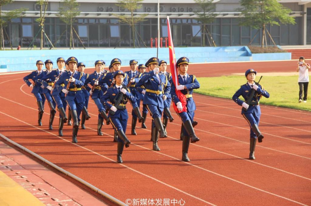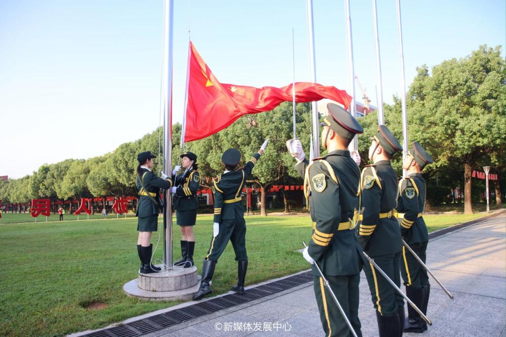伴随铿锵有力的口令,国旗护卫队队员迈着坚毅整齐的步伐,护送五星红旗走向升旗台。伴随着雄浑高亢的《义勇军进行曲》旋律,全场师生怀着无比崇敬的心情,齐声高唱中华人民共和国国歌,向英烈们致以崇高的敬意和深切的缅怀之情。五星红旗在朝阳中冉冉升起,激昂的旋律回荡在华商校园中。