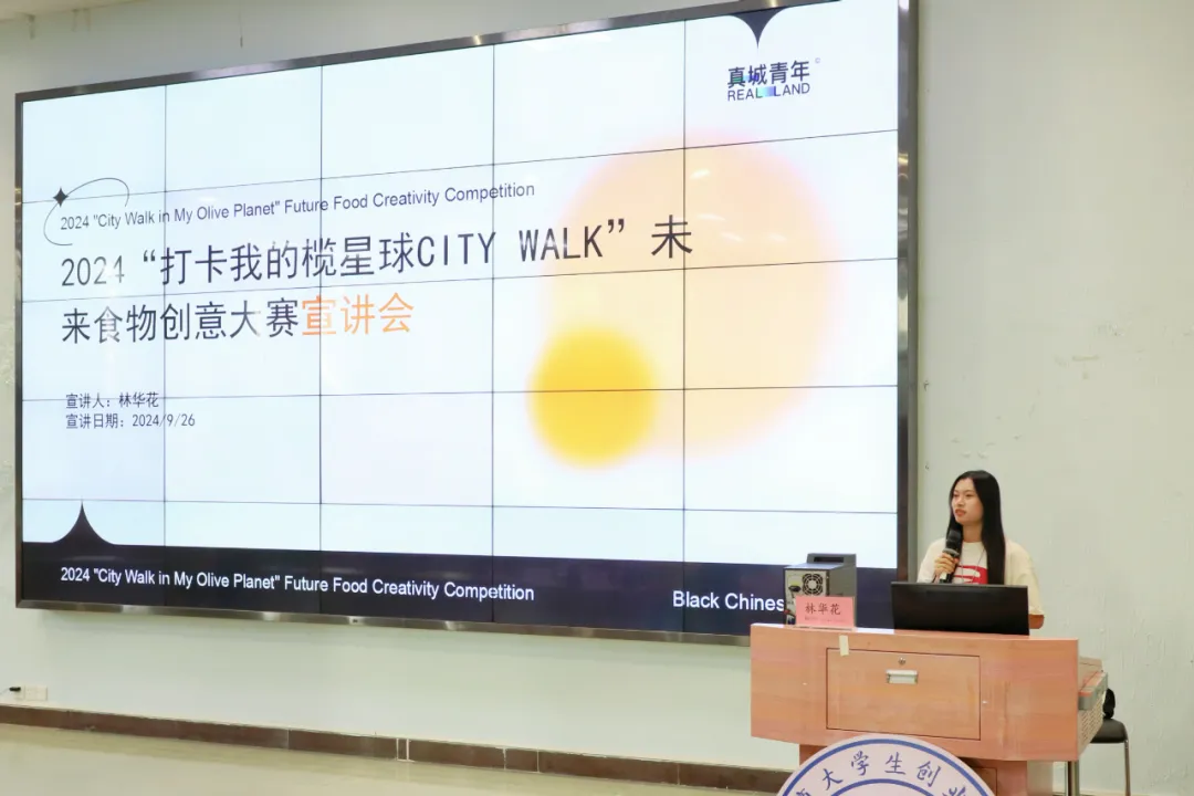 讲座最后,广州乡村振兴控股集团有限公司品牌部林华花女士带来了关于“2024打卡我的榄星球CITY WALK”未来食物创意大赛的精彩宣讲。她详细介绍了大赛的背景、主题等信息,深入介绍乌榄深厚的文化底蕴,并鼓励同学们积极参与其中,用全新视野探索开启非遗文化的传承与创新之旅,以创意和实际行动为乡村和乌榄产业贡献力量。