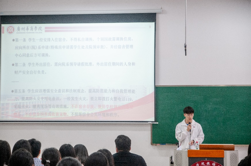 学生代表徐卓杰向同学们讲解了《学生手册》中与学生宿舍管理有关的相关规定,并强调“晚出、晚归、夜不归”的是违反校规校纪的行为。他希望同学们能自觉遵守校规校纪,扬教院学子风采。为了提高同学们自觉遵守安全纪律的意识,徐卓杰同学带领参会的全体学生代表进行宣誓,他表示,作为新世纪的青年,我们应该牢记时代使命,遵纪守时,团结向上,全面发展,秉承优良传统,争做“四有”新人,做到真心回报社会。