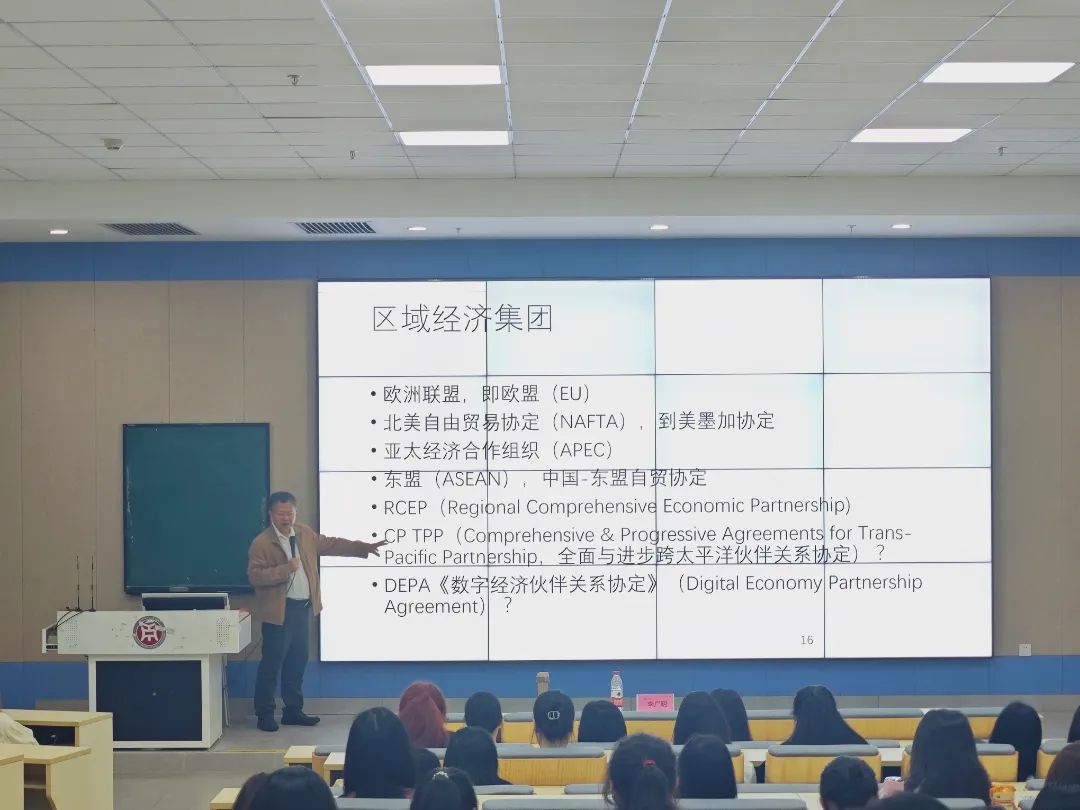 李广明教授为同学们介绍了中国服务贸易发展现状,对于中国服务贸易结构特点进行剖析,并就如何应对中国贸易的突出问题提出了自己的见解。同时,他还详细介绍了区域经济集团的基本概念和常见形式,让同学们更加全面地了解到认识当今世界经济区域集团化发展趋势。