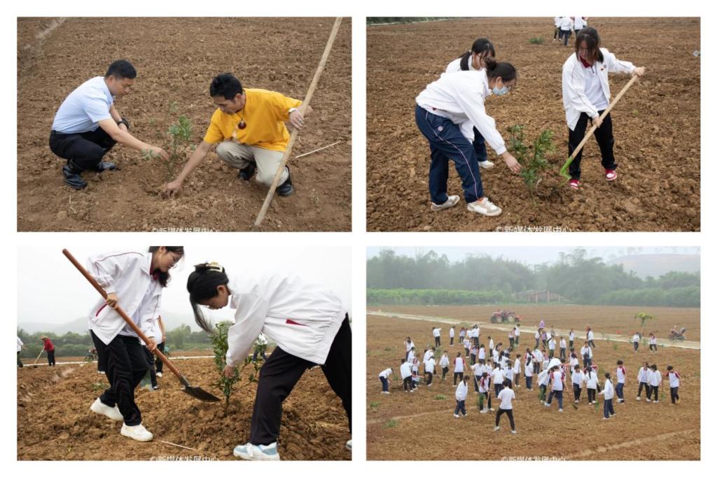 活动开始前,柑橘种植专家严勇国老师为同学们讲解关于种植果树的方法及注意事项。同学们仔细聆听,认真学习,迅速掌握相关技巧。随后,大家分组合作、互相配合、干劲十足,纷纷拿起铁铲、铁锹,种下百余棵柑橘树苗,以实际行动弘扬劳动精神,为“绿美广东”行动、乡村振兴事业贡献华商力量。