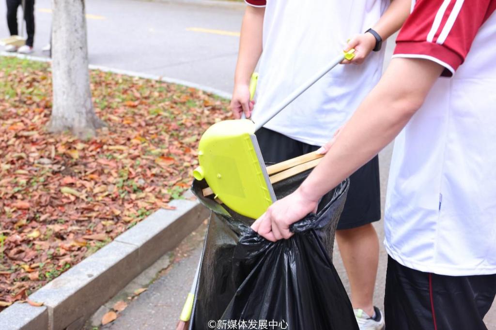 在校道上,志愿者们纷纷拿起扫把、卫生筷、垃圾袋等工具,对道路两旁的花坛及排水道的塑料袋、饮料瓶、烟头、纸屑等垃圾进行全面清理,致力于为校园创造干净、整洁、有序的环境。