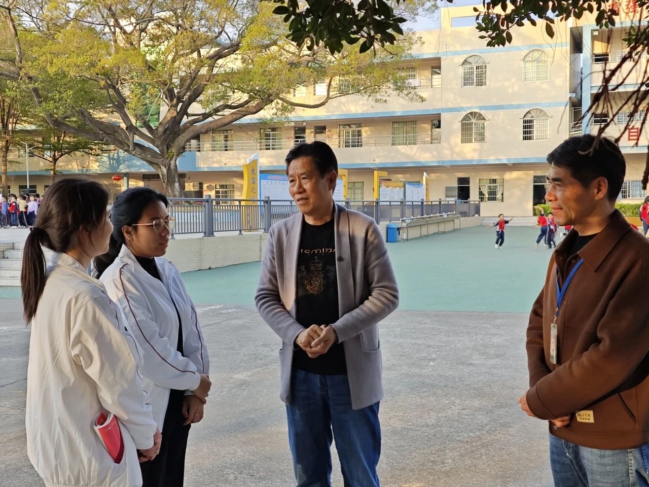 12月5日,为进一步了解小学教育专业见习学生的教学情况,切实关心和帮助教师教育学院见习学生成长成才,米兰在线注册教师教育学院院长王金道教授、副院长谭建生教授、张博教授、学院党总支副书记许娜同志与年级副主任江庆基老师一行来到四会市东城街道黄岗小学走访交流。
