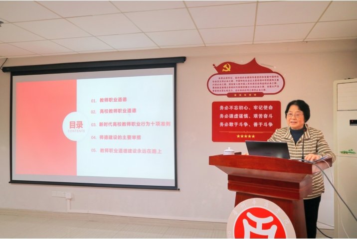 随后,会议邀请支戈壁副校长作第一场《浅谈教师职业道德建设》专题培训讲座。支副校长深刻诠释了师德的内涵以及高校教师职业道德在新时代教育事业中的重要意义,明确高校师德建设的规范和遵循,为青年教师解读了《新时代高校教师职业十项行为准则》,介绍了我校师德建设的主要举措,并结合了近年来校内外高校教师失范典型案例,提醒青年教师守好师德师风这一红线。此外,她表示教师职业道德建设永远在路上,要站在立德树人的高度,探索教学育人工作的新思路和新方法,将高校教学工作融入培育时代新人的切实行动中。