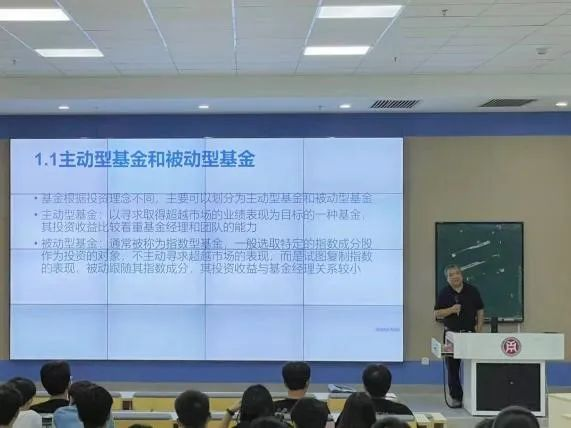 师应来教授从广义、狭义的角度分别阐述了“什么是基金”,进行基金基础知识的简介。他从基金分类的角度,讲述根据投资理念、主要投资对象等的不同,将基金分为主动型基金、被动型基金,股票型基金和债券型基金等。