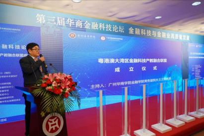 刘少波教授代表联盟发起单位致辞,他介绍了联盟成立的背景和意义以及联盟的基本定位,并指出,联盟致力于搭建一个粤港澳大湾区金融科技专业建设、人才培养和产教融合的开放式交流平台。联盟成员将通过开展各种交流活动,在金融科技专业建设、人才培养和开展产教融合等方面进行信息沟通和多渠道、多维度、多元化合作,实现成员单位之间优势互补和合作共赢。随后,郭银华、刘少波以及所有联盟发起单位代表共同为联盟成立揭牌。