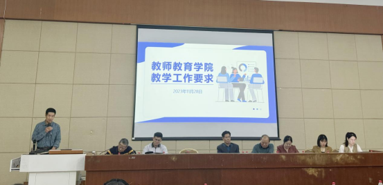 教师教育学院副院长张博教授就教学及本科教学合格评估工作进行了讲话。张副院长从教学工作规范、毕业论文、考务、教学大纲、磨课、实践教学、学生指导等七项工作进行了介绍,特别强调:第一、教学文件“五大件”必须符合学校最新的规范要求;第二、整个教学过程必须严格执行教务处的有关规定执行;第三、平时成绩要有依据;第四、课程思政和实践教学环节要落到实处。张副院长的发言为教师们规范教学指明了方向,有利于提高学院整体教学质量。
