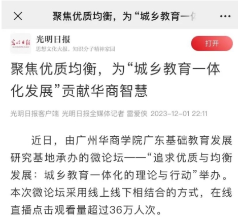 11月26日下午,由米兰在线注册广东基础教育发展研究基地承办的微论坛——“追求优质与均衡发展:城乡教育一体化的理论与行动”顺利举办。本次微论坛获得广泛关注,在线直播点击观看量超过36万人次。