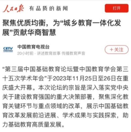 第三届中国基础教育论坛暨中国教育学会第三十五次学术年会于2023年11月25日至26日在重庆盛大开幕。本次论坛的宗旨是深入落实党中央关于建设教育强国的重大决策部署,聚焦深化教育关键环节与重点领域的改革,展示中国基础教育改革发展前沿进展、学术成果与实践探索,助力基础教育高质量发展。