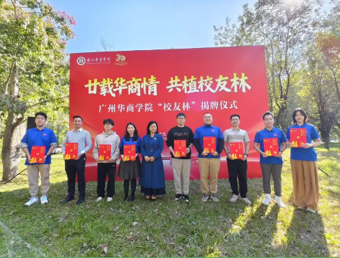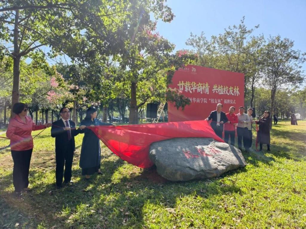 仪式伊始,廖榕就董事长、陈玉欢书记、吕峻闽副校长、许娜副校长、郭银华会长、王锦秀顾问与校友代表黄伟、马列、侯意雄等共同为校友林揭牌。当红色幕布缓缓落下,“校友林”三个大字熠熠生辉,自此,这片林木正式成为华商校园中连接过往与未来的情感枢纽,成为传承华商精神的文化地标。