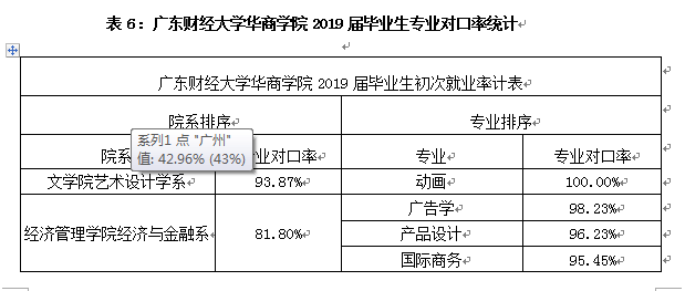 从表中看,学校2019届毕业生就业的专业对口率平均为71.62%。其中,我校2019届毕业生初次就业专业对口率在其所在院系中,文学院艺术设计学系专业对口率最高,为93.87%;其次是经济管理学院经济与金融系,为81.80%;再次是会计学院,为76.05%;专业对口率较低的为国际学院、数据科学学院、文学院外语系,分别为64.00%、49.48%、39.94%。