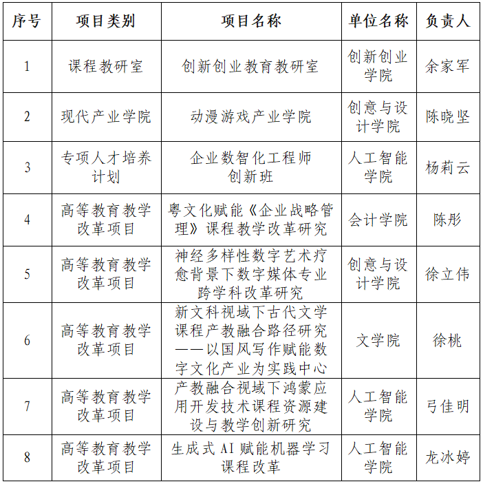 根据《广东省教育厅关于开展2025年度广东省本科高校教学质量与教学改革工程项目申报推荐工作的通知》文件精神,学校组织开展了2025年度省级教学质量与教学改革工程项目申报推荐工作。经个人申报、所在单位审核推荐、教务处资格审核、校外专家评审及学校教学指导委员会审议等程序,遴选出我校2025年度省级教学质量与教学改革工程拟推荐项目8项,包括课程教研室1项,现代产业学院1项,专项人才培养计划1项,高等教育教学改革项目5项。现将拟推荐项目名单予以公示(见附件)。