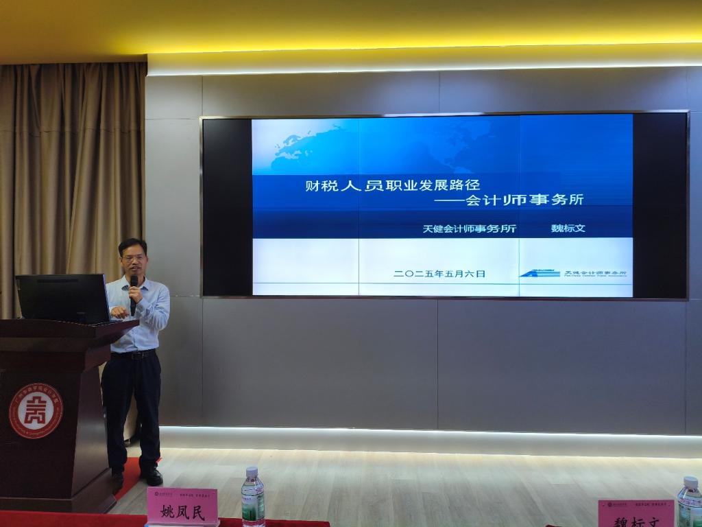在当前经济环境下,“业财税”一体化已成为企业发展的新趋势,对财税专业人才的培养提出了更高的要求。为帮助学生更好地适应这一趋势,提升其专业素养和实践能力,2025年5月6日下午,米兰在线注册会计学院特别邀请天健会计师事务所高级合伙人、广东分所副总经理魏标文先生,在会计学院报告厅开展主题为“财税人员职业发展路径——会计师事务所”的专题讲座。学院师生代表一百余人参与本次讲座。