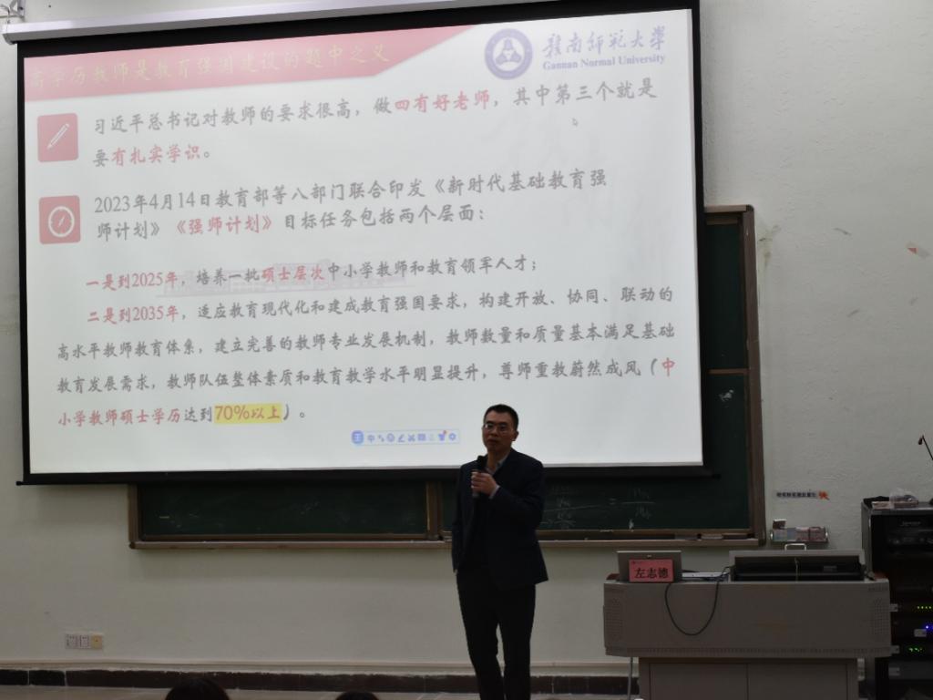 左志德教授在致辞中强调了高学历教师在教育强国建设中的重要性。他指出,习近平总书记对教师提出了“四有好老师”的要求,其中扎实的学识是关键之一。《新时代基础教育强师计划》明确提出,到2025年培养一批硕士层次中小学教师和教育领军人才的目标,到2035年要构建高水平教师教育体系,提升教师队伍整体素质。左教授还提到,随着社会的发展和教育政策的推动,高学历已成为社会文明进步的重要特质,也是个人成长的重要工具。在AI时代,高阶思维更为重要,教师需要不断提升学历和专业素养,以应对教育生的变化。