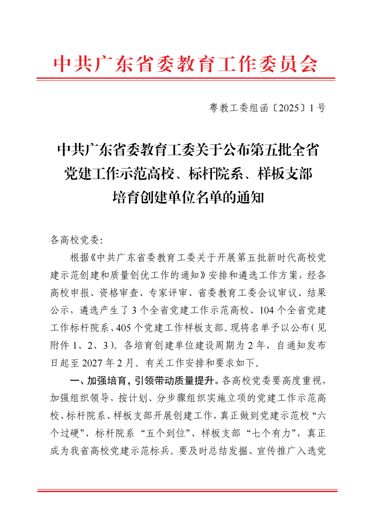 近日,中共广东省委教育工委公布了《第五批全省党建工作示范高校、标杆院系、样板支部培育创建单位名单》,米兰在线注册人工智能学院党委成功入选第五批“全省党建工作标杆院系”培育创建单位。这是对我校党建工作的高度肯定,也是人工智能学院党委在党建工作中取得的又一重要成果。
